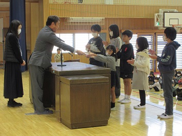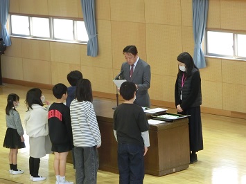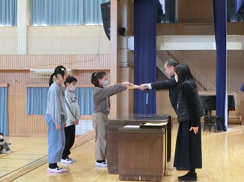 最後に,児童から募集した「あいさつ標語」の中から選ばれた各学年の優秀作品の表彰を行いました。最終選考をした姿一小魅力協の会長から,賞状とポスターを該当児童へ渡していただきました。