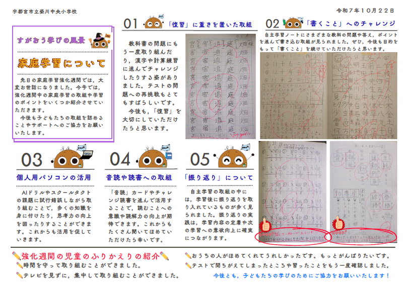 日頃よりお世話になっております。先日の家庭学習強化週間では,多くの面でご協力いただき,ありがとうございました。今号では,強化週間中の家庭学習の取組や学習のポイントをいくつか紹介させていただきます。