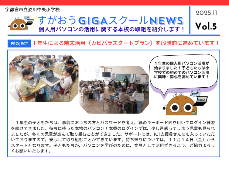 お世話になります。この度,「R07_すがおうGIGAスクールNews05」を作成いたしました。今号では,1年生児童の端末活用の取組を紹介しております。ぜひ,ご覧いただけたらと思います。