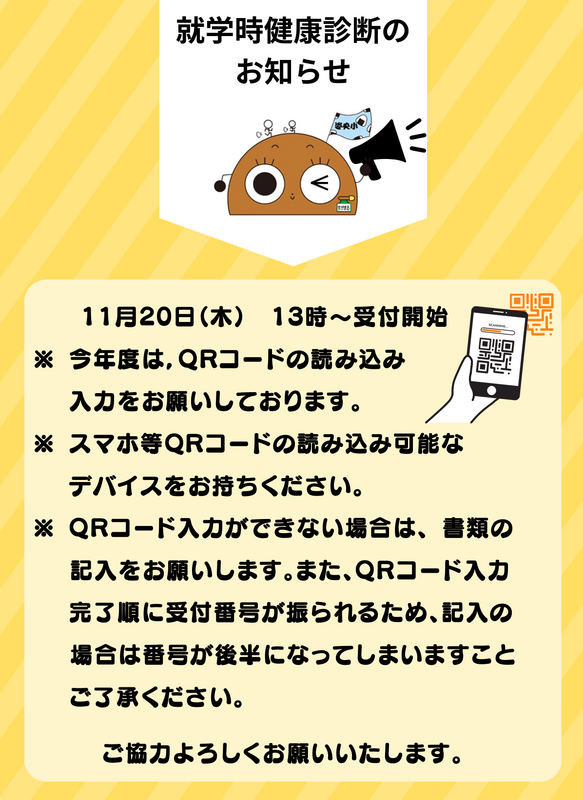 日頃よりお世話になっております。標記の件につきまして,お知らせいたします。以下の「就学時健康診断のお知らせ」をご確認ください。どうぞ,よろしくお願いいたします。