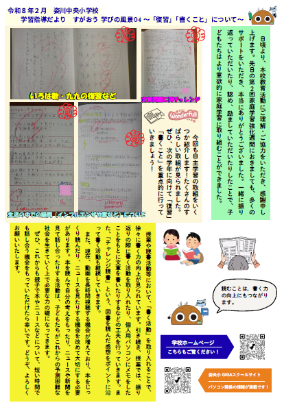 この度,学習指導だより「すがおう 学びの風景04 〜「復習」「書くこと」について〜」を作成いたしましたので,ご覧いただけたら幸いです。