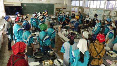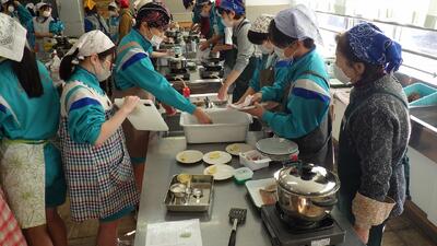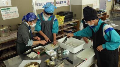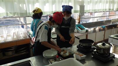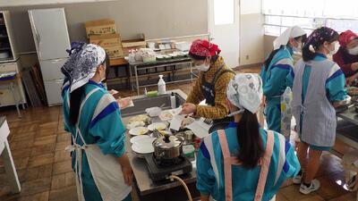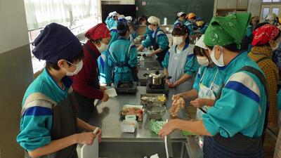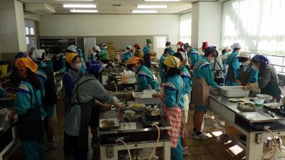 本日も、2年生の家庭科の授業では、地域ボランティアの方々にご協力いただいて安全に調理実習を行いました。今回のメニューは「鮭のムニエル」と「野菜スープ」です。地域ボランティアの方々は子どもたちに教えすぎず、主体的に調理ができるように適度な塩梅でご指導くださるので、充実感をもって活動していました。