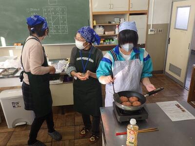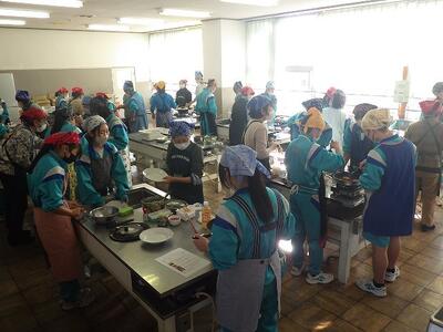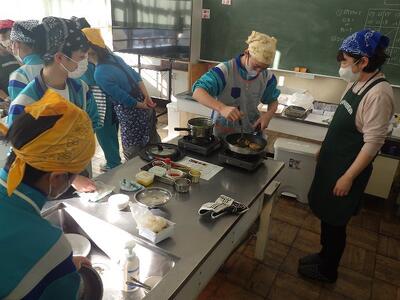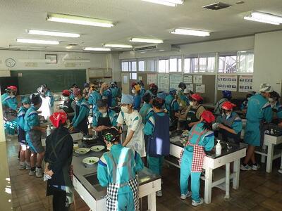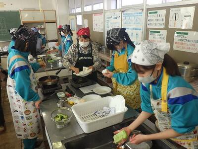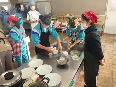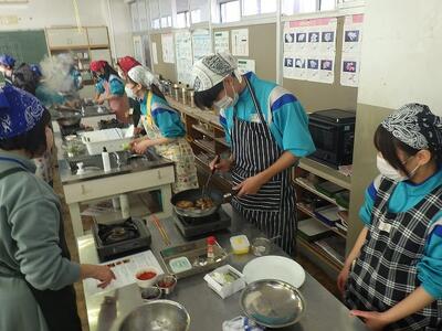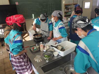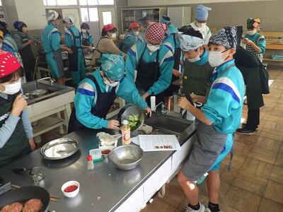 2学期後半も、2年生の家庭科の授業では、地域ボランティアの方々にご協力いただいて安全に調理実習を行っています。今回のメニューは「煮込みハンバーグ」です。地域ボランティアの方々は子どもたちに教えすぎず、主体的に調理ができるように適度な塩梅でご指導くださるので、充実感をもって活動していました。