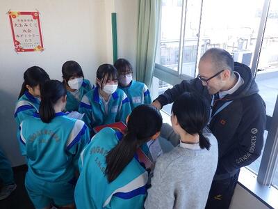 全校集会では、校長先生から、新年を迎え「当たり前のことに徹底的に取り組むことが皆さんの成長のためには大切です。」というお話がありました。続いて、本校事務長先生からの講話をいただきました。事務長先生には、学校事務の仕事と、仕事とは別に取り組んでいる絵画制作について紹介していただきました。絵画については、毎年、大きな作品展に出品していることや、作品作りでは悩むことも多くある一方で、それを超える充実感や達成感について教えていただきました。また、これまでに苦手だと思っていた中学時代の学習内容が役に立っているエピソードに、頑張る勇気をいただきました。