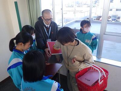1月9日(金)3時間目、3年生で「ソーシャル・ビュー 見えない人と楽しむ美術鑑賞」【相互理解、寛容】の道徳の授業を行いました。その授業の導入で、先日紹介された事務長先生の絵画を活用しました。全盲の方と、目が見える方が絵画を鑑賞し、目が見える方が伝えた絵画の情報に対して、全盲の方がより詳しい説明を求め、それに答える中で、目の見える方が気が付かない解釈の部分を広め、お互いに美術鑑賞を楽しむという教材でした。