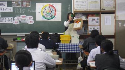 2回目のお弁当の日に向けて、家庭科や学級活動の時間に家庭科担当、学級担任とともに「栄養教諭」が授業に入り、栄養面などからしっかり考えて作れるよう学習しています。実際にお弁当箱の容量を確認したり、ごはんや主菜、副菜を弁当に詰める際のコツを教えてもらったり、レシピ集を見てお弁当に入れるメニューについて、考えたことをワークシートにまとめました。