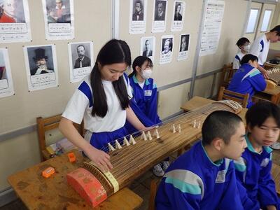 1年生は、音楽の授業で箏で「さくら さくら」を爪弾きました。ほとんどの生徒が初めて触れる本物の箏に、最初は緊張した面持ちでしたが、独特の爪をはめて弦を弾くと、音楽室に凛とした美しい音が響き渡りました。