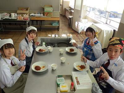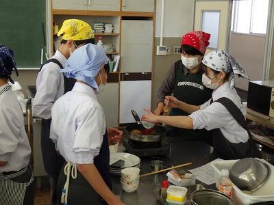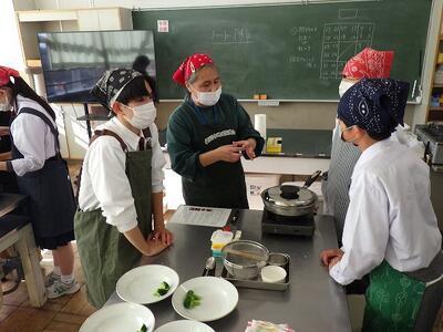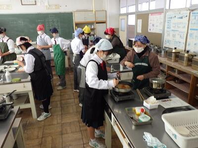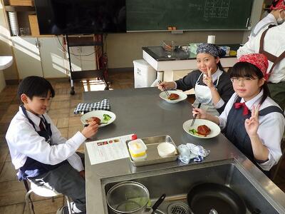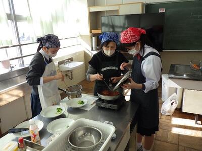 1月20日(火)、2年生の家庭科の授業では、地域ボランティアの方々にご協力いただいて安全に調理実習を行っています。今回のメニューは「煮込みハンバーグ」です。地域ボランティアの方々は子どもたちに教えすぎず、主体的に調理ができるように適度な塩梅でご指導くださるので、充実感をもって活動していました。