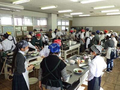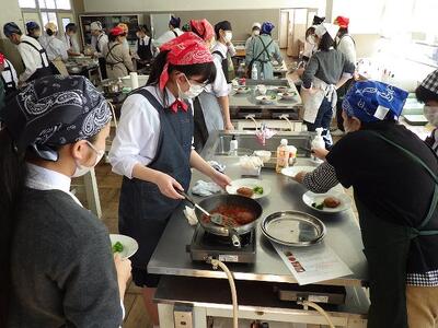 1月21日(水)。本日も調理室のある南校舎3階は、ハンバーグのいい匂いが漂っていました。2年生の家庭科の授業では、地域ボランティアの方々にご協力いただいて安全に調理実習を行っています。メニューは「煮込みハンバーグ」です。地域ボランティアの方々は子どもたちに教えすぎず、主体的に調理ができるように適度な塩梅でご指導くださるので、充実感をもって活動していました。