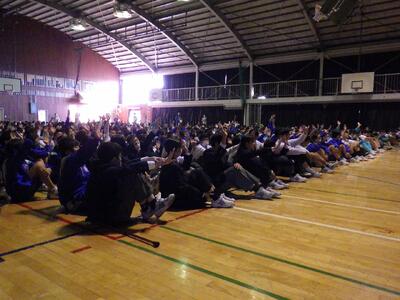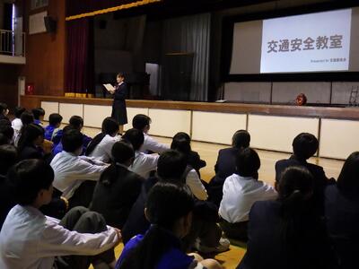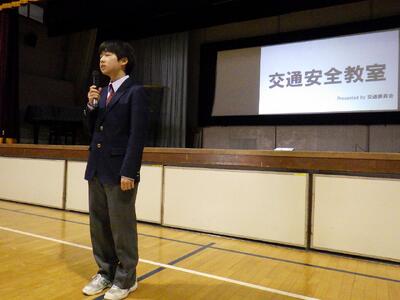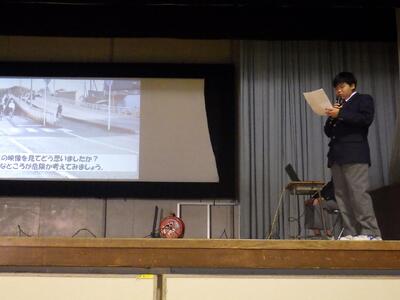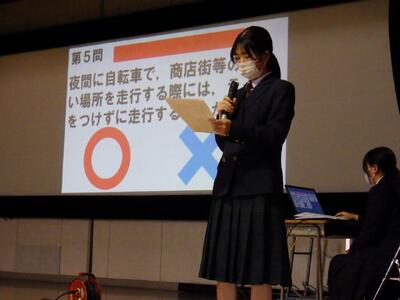11月20日(木)6時間目に体育館で交通安全教室を行いました。今回は、交通委員会の皆さんが作成した「交通ルールに関するクイズ」、「登下校路における危険予測」の2部構成で行われました。交通ルールに関するクイズでは、自転車運転に関する13問のクイズが出題されました。どの問題も、安全に運転するためには知っていてほしい内容でしたが、思ったよりも苦戦していたようでした。登下校路における危険予測では、姿川中学区の自転車運転で気を付けなければならない「四大危険地帯」を安全に通行するための注意点について全校生で考えました。