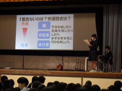 最後の結びでは、『自動車、自転車、歩行者を比べて、交通弱者についてふれ、自動車から見れば自転車が交通弱者にあたりますが、自転車から見れば歩行者が交通弱者になります。自分の運転を客観的にとらえ見直してみましょう。なにより、命を守るために・・・』と締めくくりました。