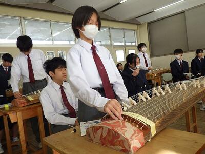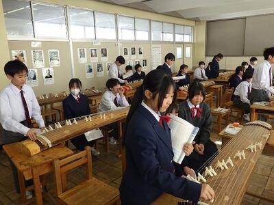 1年生が音楽の授業で箏で「さくら さくら」を爪弾きました。ほとんどの生徒が初めて触れる本物の箏に、最初は緊張した面持ちでしたが、独特の爪をはめて弦を弾くと、音楽室に凛とした美しい音が響き渡りました。