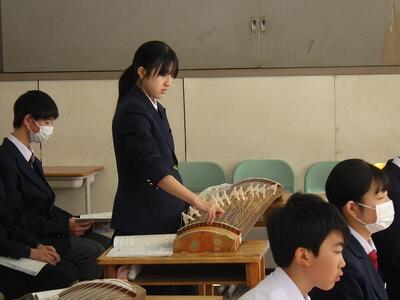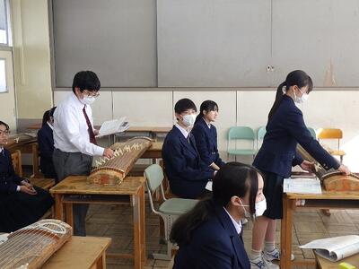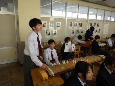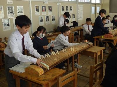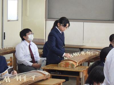 1年生は、音楽の授業で箏で「さくら さくら」を爪弾きました。ほとんどの生徒が初めて触れる本物の箏に、最初は緊張した面持ちでしたが、独特の爪をはめて弦を弾くと、音楽室に凛とした美しい音が響き渡りました。