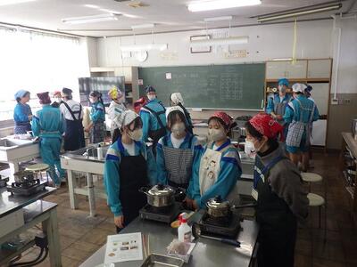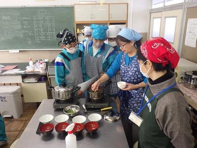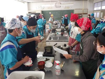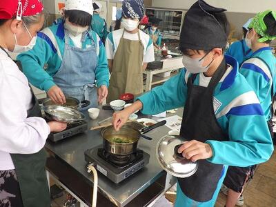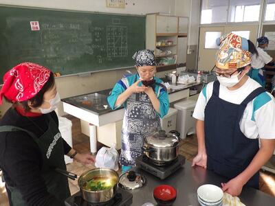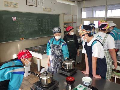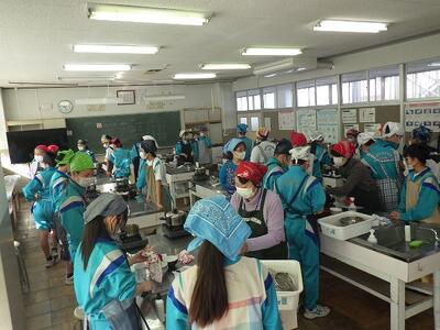 2月6日(金)。2年生の家庭科の授業では、地域ボランティアの方々にご協力いただいて安全に調理実習を行っています。メニューは「炊き込みご飯」と「お吸い物」です。