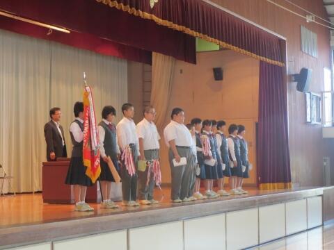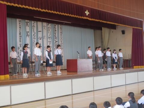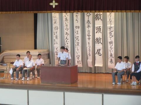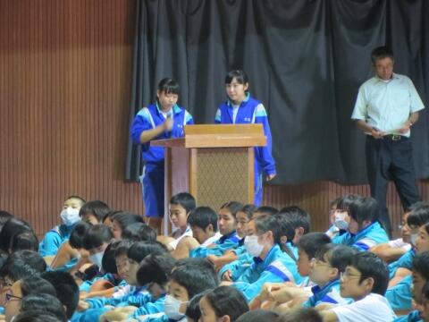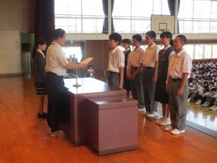 ・1学期終業式が行われ、各学年の生徒代表から1学期の反省などが発表されました。また、宇河地区新人大会の表彰と役員の任命も行われました。