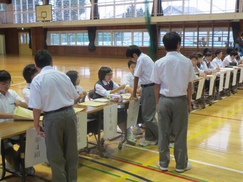 ・今日の生徒会朝会は、図書委員会の主催で行われました。工夫を凝らした「図書」に関わる問題が出され、生徒のみなさんは興味を持って参加することができました。