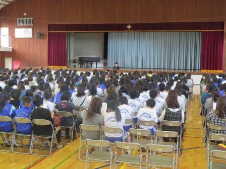 授業を見学の後、体育館で「先輩」から、学校の生活や部活動、勉強のことについて説明を受けました。少しでも不安を取り除いて、入学してくれるとよいと思っています。