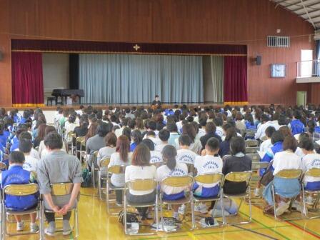 ・1学期前半最終授業日でした。5時間目に、全校集会が開かれ、学習面や生活面について有意義なものになるようお話を聞きました。