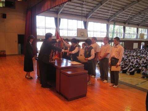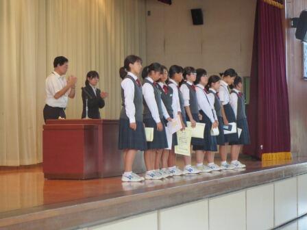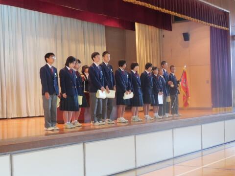 ・全校朝会が行われました。先日行われた、県新人大会等の活躍が表彰されました。