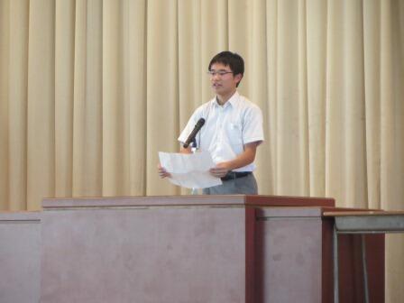 ・今日は、1学期終業式が行われました。各学年代表の生徒が『1学期を振り返って』作文を発表しました。式の前には、各種大会の表彰等が行われました。