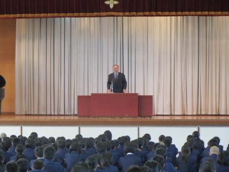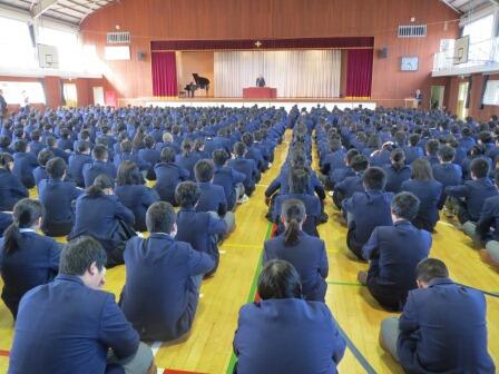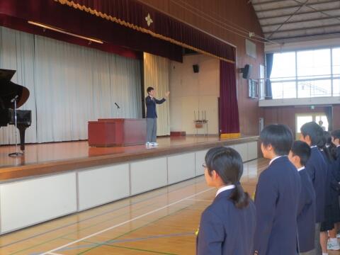 今年初めての『生徒会朝会』でした。各専門委員長の任命が行われました。その後、生徒会執行部や専門委員会から今年の抱負が述べられました。生徒会長からは、「いじめゼロ宣言」や「熊本地震被災者への義援金」の呼びかけがありました。