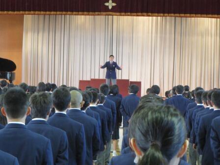 ・生徒会朝会が行われ、生徒会長はじめ執行部や専門委員長からのあいさつがありました。今年度の生徒会活動が活発に行われるように期待しています。
