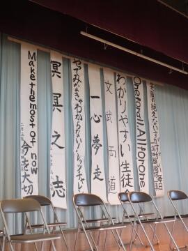 ・今日の朝会では、校長先生から宿題として出されていた『今年の目標を漢字一文字で表そう』の発表会でした。生徒全員が取り組み、各クラスの廊下に掲示しています。来校の際は、ご覧ください。
