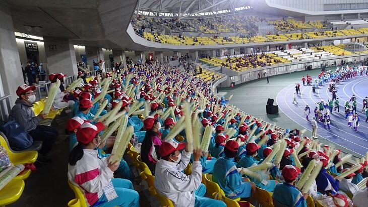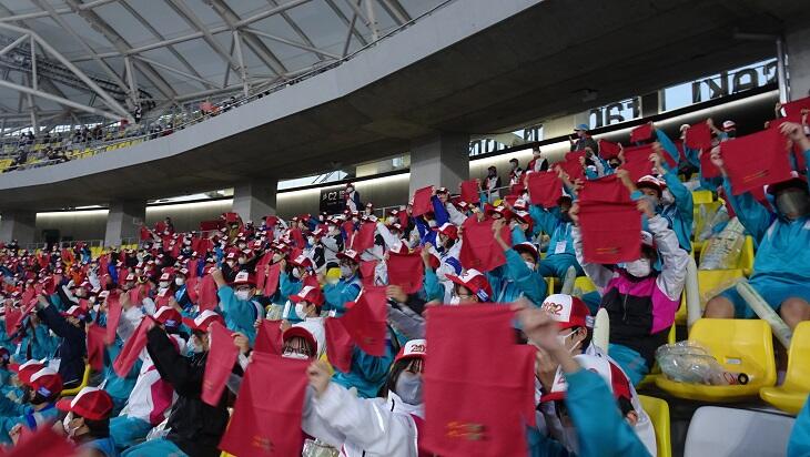 天気はまさに秋晴れ、スタンドは風が吹くとちょっと肌寒い感じでしたが、本校の1・2年生と横川中学校の生徒が、ハンドタオルやスティックバルーンを使った応援で大いに会場は盛り上がりました。他県の選手団や栃木県の選手団の方々も姿中生に大きなアクションで手を振っていただきました。