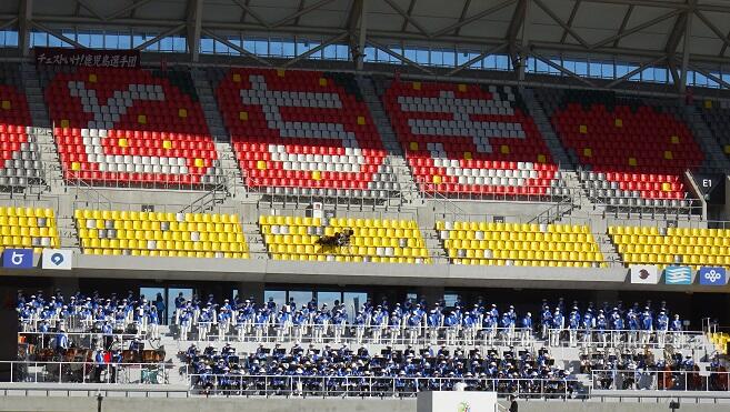 *天気はまさに秋晴れ、閉会式前のボランティア活動の様子を紹介します。各都道府県の選手の皆さんが座る椅子を丁寧に設置しました。見事な配置を画像にてご確認ください。