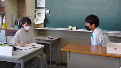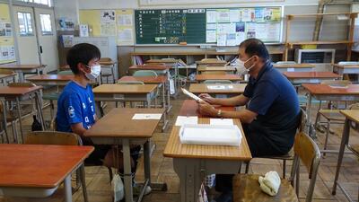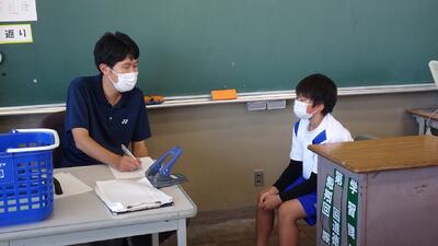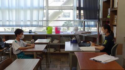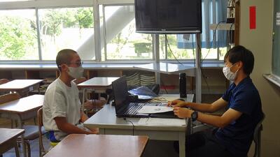 ※レベル1の中、各教室にて、マスクの着用、換気、身体的な距離をとるなど基本的な感染対策を図りながら、15分程度の面談を行いました。担任の先生に今頑張っていることや不安に思っていることなどを話したり、時折、「えぇ~そうなの?」とリアクションしたり、笑い声も聞こえたりするなど、とても雰囲気の良い中で行われました。