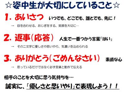 *あいさつが校内中に飛び交う、優しさと思いやりあふれる姿川中学校にしていきましょう。