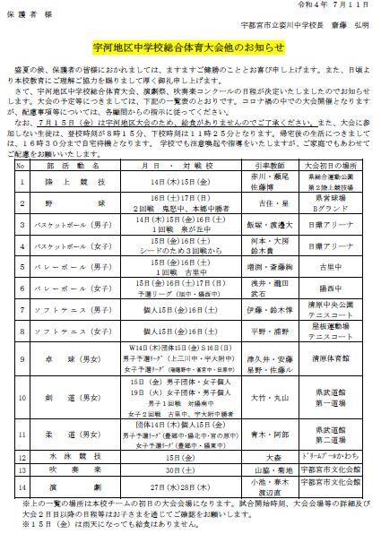 7月11日(月)、宇河総体大会のご案内を配付しました。
