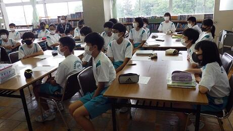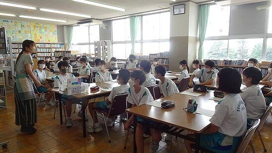 7月5日(火)、2年生が図書室司書によるブックトークを行いました。司書の先生からの宇都宮空襲(1945年7月12日)やその時の被害状況や焼夷弾とは?など具体的な戦災時の説明を真剣に聞いていました。