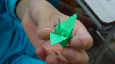 午後の時間に被爆体験のDVDを視聴し、平和への願いを込めて折り鶴を作成しました。
