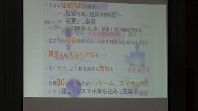校医の先生が「寝る子は育つ」と題して、「睡眠中の脳の働き・体内時計と睡眠圧の関係」、「メラトニンの低下の原因」、「中学生に必要な睡眠時間」「眠りのサイクルと成長ホルモンの関係」等、パワーポイントを使った図やイラストで丁寧に解説していただき、十分な睡眠をとることや健全な日常の大切さ、寝ても覚めても夢に生きる、睡眠不足が体や脳に及ぼす影響について詳しく知ることができました。