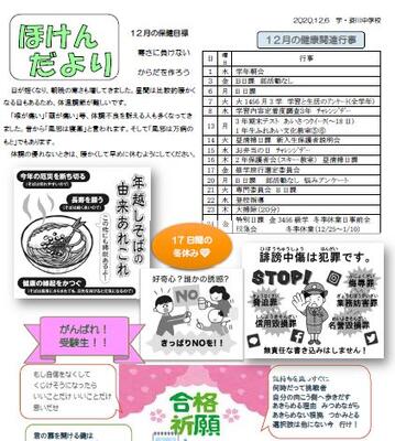 12月6日(月)、保健だより(12月)を発行しました。養護教諭から「受験生への熱いメッセージ」、新型コロナ変異株(オミクロン株)、感染予防対策など記事が載っています。