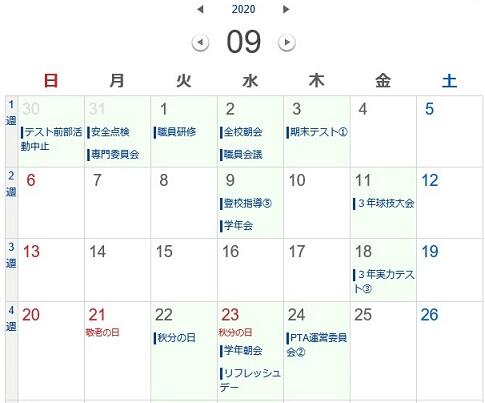 ※【メニュー】の行事予定表をクリクすると下記のカレンダーが表示されます。