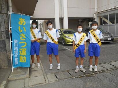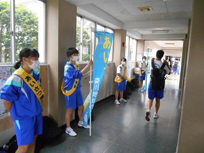 9月1日(火)、コロナ禍゚で実施できなかった生徒会による「姿中あいさつウィーク」がスタートしました。当番は2年1組の生徒全員と生徒会執行部役員が、東・西昇降口の2か所に分かれて行いました。