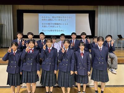 最後の結びでは、『自動車、自転車、歩行者を比べて、交通弱者についてふれ、自動車から見れば自転車が交通弱者にあたりますが、自転車から見れば歩行者が交通弱者になります。自分の運転を客観的にとらえ見直してみましょう。なにより、命を守るために・・・』と締めくくりました。