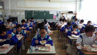 会話を楽しみながら、給食をいただいています。
