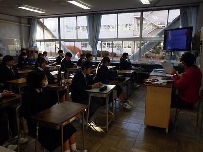 *1、2年生の授業を参観後、体育館で1年生の代表生徒が中心になって姿川中学校をより詳しく知ってもらおうと、中学校生活(登校の様子や日課表、授業の様子、主な学校行事等)のプレゼンでアピールしました。