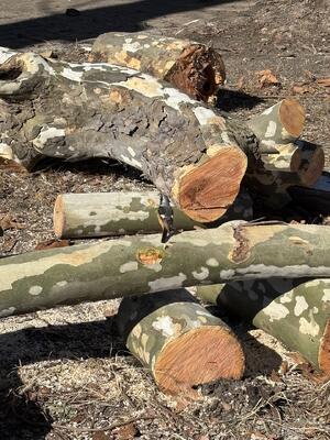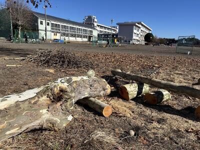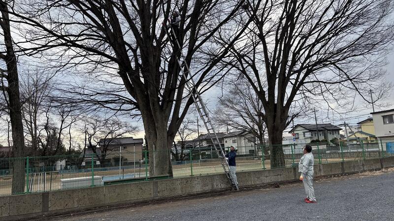 1月10日(金)、本校労務主事と副校長で野球グラウンド西にあるプラタナスの巨木の剪定を行いました。この巨木は4階建ての本校校舎と同じくらいの高さで、夏は日陰を作ってくれているのですが、秋から冬にかけて多くの落ち葉、枯れ枝を落としてくれます。昨年末にかけて多くのボランティアの方々にご協力いただいて落葉を回収していただいたところですが、葉が落ちたこの期間に次年度に向けて剪定を始めました。