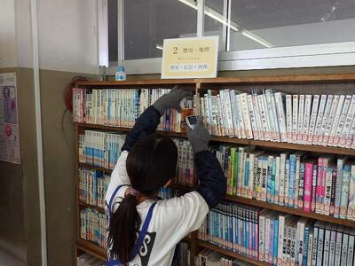 数多くある蔵書を司書教諭が1冊1冊バーコードで読み込みながら点検をしています。