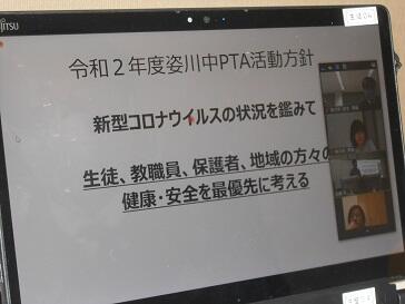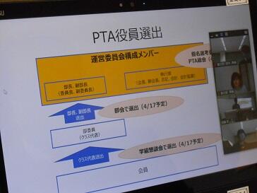 前回同様、PTA会長及び校長がリモートを使って挨拶し、PTA会長が議事を進めました。会長からパワーポイントを使っての活動総括、令和3年度事業計画、令和3年度活動体制等、様々な提案がありました。