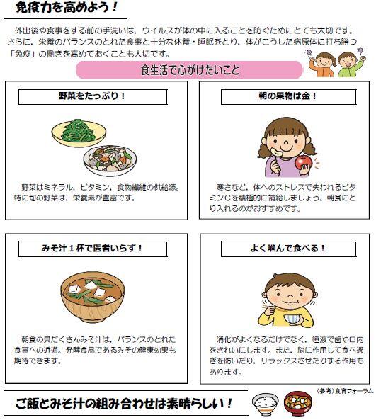 主な内容は、家庭でも正しい食事マナー・イラストで表示、免疫力を高めよう、ご飯とみそ汁の組み合わせは素晴らしい!です。