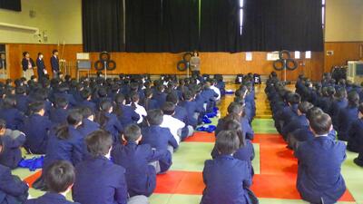 3月18日(水)、1,2年生は今年度最後の学年朝会を行いました。学年の先生方に様々な言葉をいただいたり、学級委員の生徒が振り返りを発表したりと、様々な締めくくりを行いました。最後には学年主任からは次年度に向けての期待と激励のお話がありました。「Shine on ・ 拓く ~一生懸命はかっこいい~」
