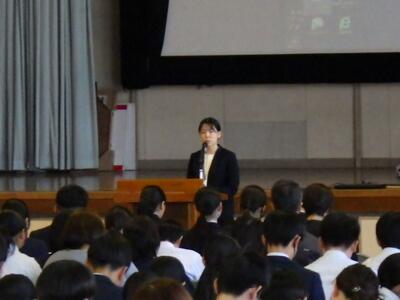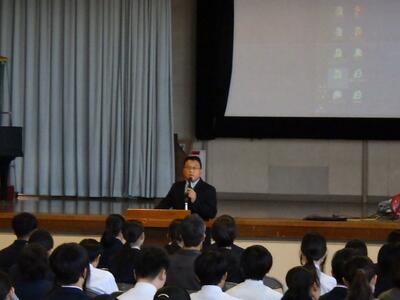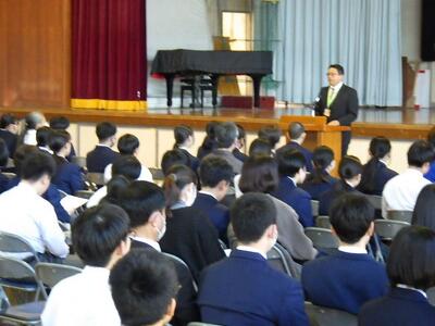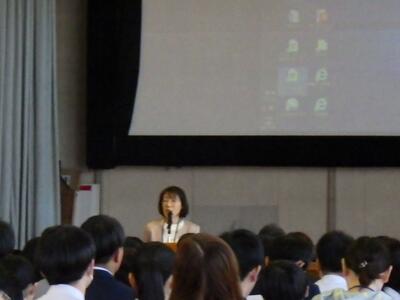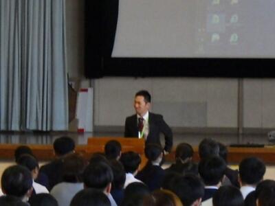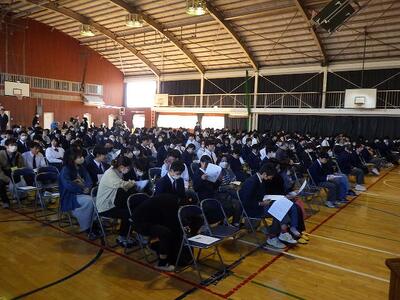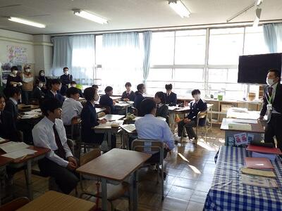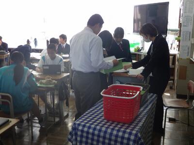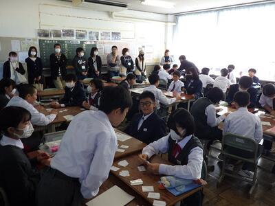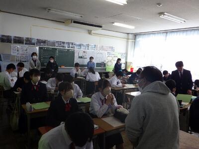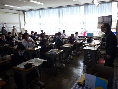 本校では、1時間目に普通授業を行い、1年生は、2,3時間目にキャリア教育で講師の方々をお招きして「働く人に学ぶ」の授業を行いました。2年生は、2,3時間目に12月に行われる社会体験学習についての授業を行いました。2年生は、体育館を会場に保護者の方と生徒が一緒に「スマホ・ケータイ安全教室」「県立高校入試説明会」を行いました。