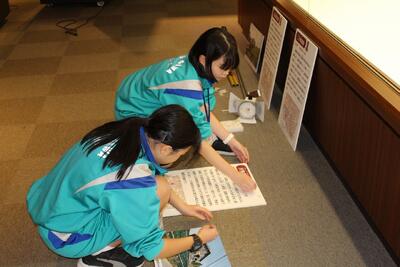 *廊下アート「ようこそ姿川中へ」:南校舎東1階階段をご覧ください。