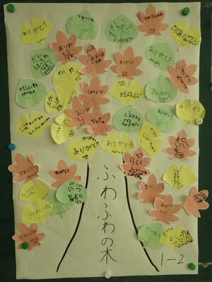 冬休み前朝会では、校長から「今年がんばったことを思い出して自分をほめよう」という話をしました。また、11月の「いじめゼロ強調月間」に各クラスで実施した「ふわふわの木」について、1年2組とそよかぜ3組のものを紹介しながら、「悪い言葉が人の心をダメにする。よい言葉ですてきな心を育てよう」と呼びかけました。最後に、児童指導主任から冬休みの安全な過ごし方について注意喚起を行いました。