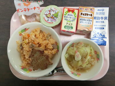 そして、今年最後の給食はクリスマスメニューでした。写真には全種類のデザートが乗っていますが、「ミニチョコレートケーキ」「ミニチョコレートケーキ(アレルギー対応)」「いちごプリン」「ポンデドーナツ」の中から事前に希望を取って、子供たちはそれぞれ自分が好きなデザートを選びました。